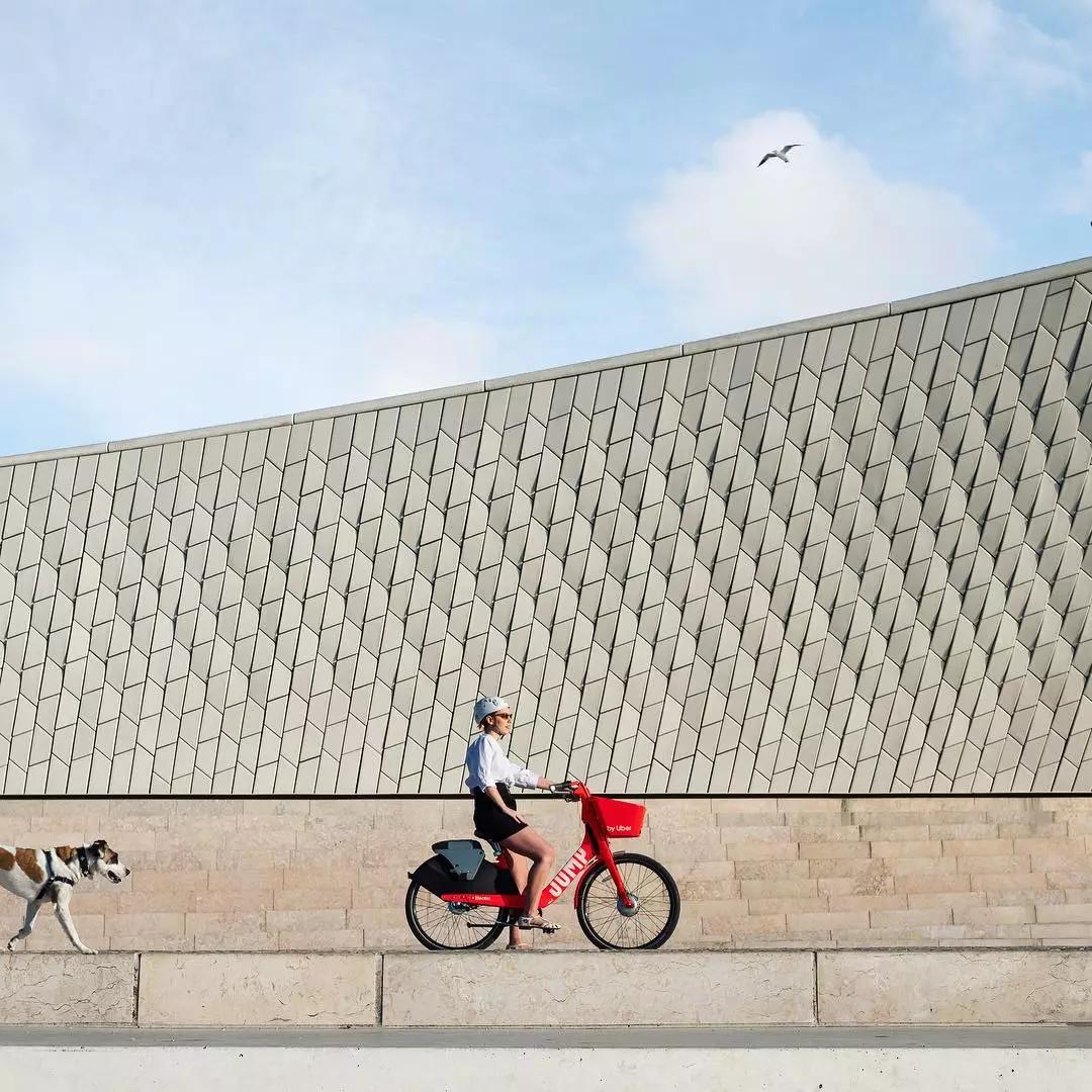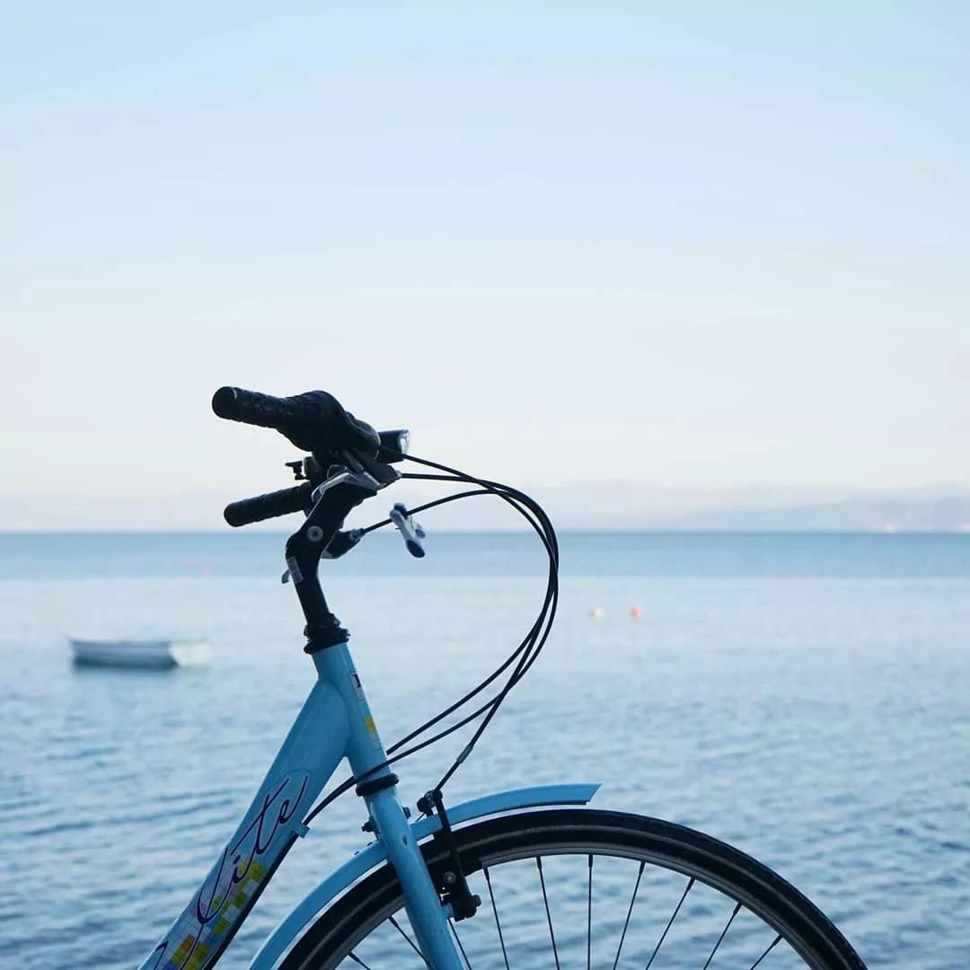 以虛化的大海與藍天為拍攝背景,畫面簡潔而干凈,將自行車的車頭作為近景拍攝的主體部分,藍色外觀與背景顏色相呼應,營造出一種清新靜謐感,同時也突顯出自行車的架構。