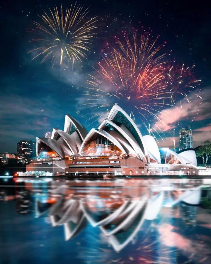 拍攝澳大利亞悉尼歌劇院,采用中景拍攝,將歌劇院特有的帆造型展現在觀者面前,感受建筑設計的獨特魅力,夜空中綻放的煙花讓畫面更有趣味性,烘托出熱鬧的氛圍。