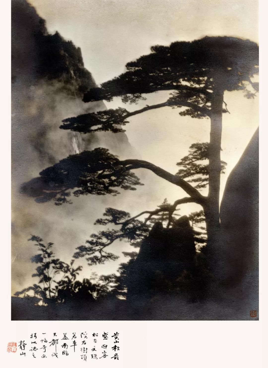 這件郎靜山創作的《云影松風》是我數十年來花心思尋覓來的珍品,因年久而泛起的那層銀鹽黝澤,恍似絳云薄紗掩映著蒼松虬枝,迎送紛至沓來的游人,襯板上有其親筆題跋:“黃山松最盛,迎客松在文殊院左,樹頂若車蓋,南臨天都,誠一幅奇畫,攝以志之。”情見乎辭,讀來神馳,我崇敬拍攝出如此雋永之作的老者,也理應寬宥那些旨趣淺陋、無緣玩過120和135 菲林的后生。