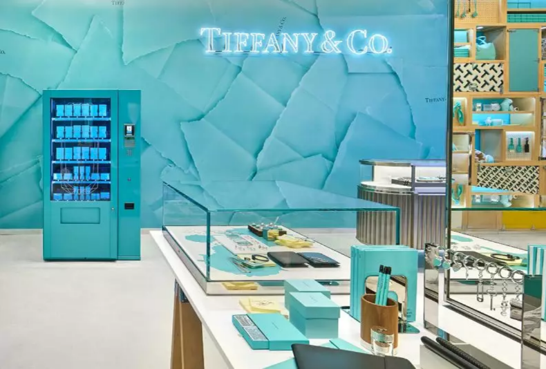 與此同時,店內還有一臺自動售賣機,專門售賣Tiffany最新香水、現場雕刻的珠寶和皮革壓花產品,顧客可在屏幕上設計元素,最后融入到吊墜和其它產品上。