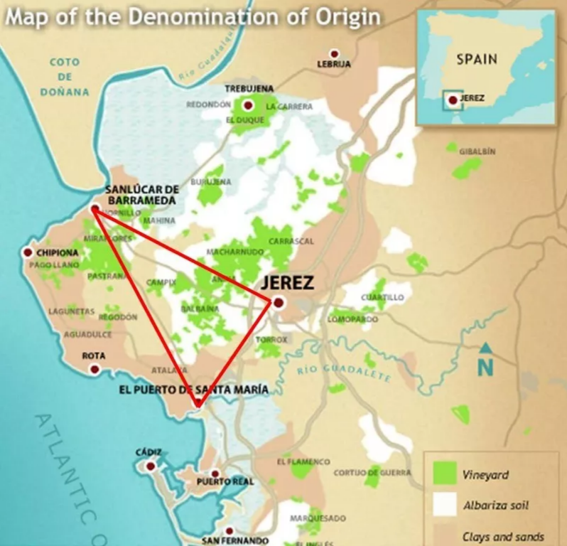 雪莉三角區位于西班牙西南部的安達盧西亞自治區。主要產地是赫雷斯(Jerez),再加上兩座海邊小城Sanlúcar de Barrameda和El Puerto de Santa María。全世界的“真”雪莉,只產自這三個地方。