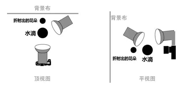 拍攝時,鏡頭盡量保持平視或者是仰視,拍出來的照片會有一種身臨其境的視覺效果。因為處在室內環境下,周圍的光線可能不太好,需要我們進行布光,才能拍出水滴的晶瑩剔透。