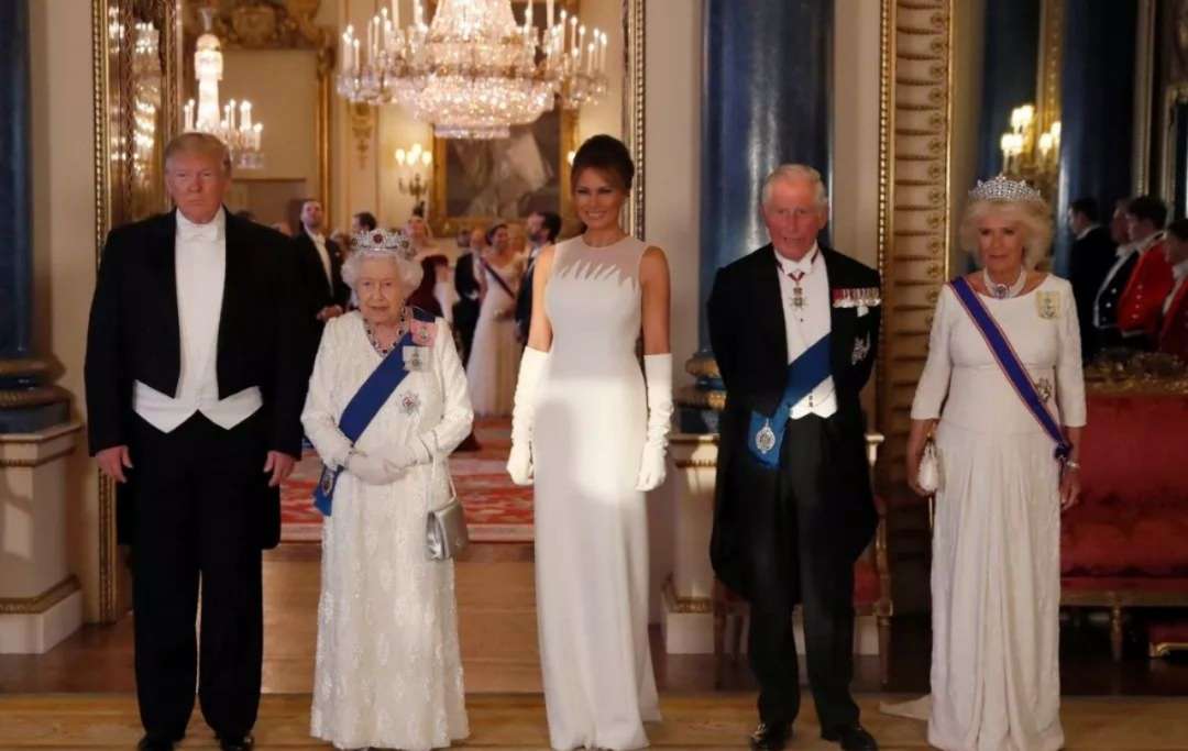 左起:唐納德·特朗普、伊麗莎白二世女王、梅拉尼婭·特朗普、菲利普親王、康沃爾公爵夫人卡米拉