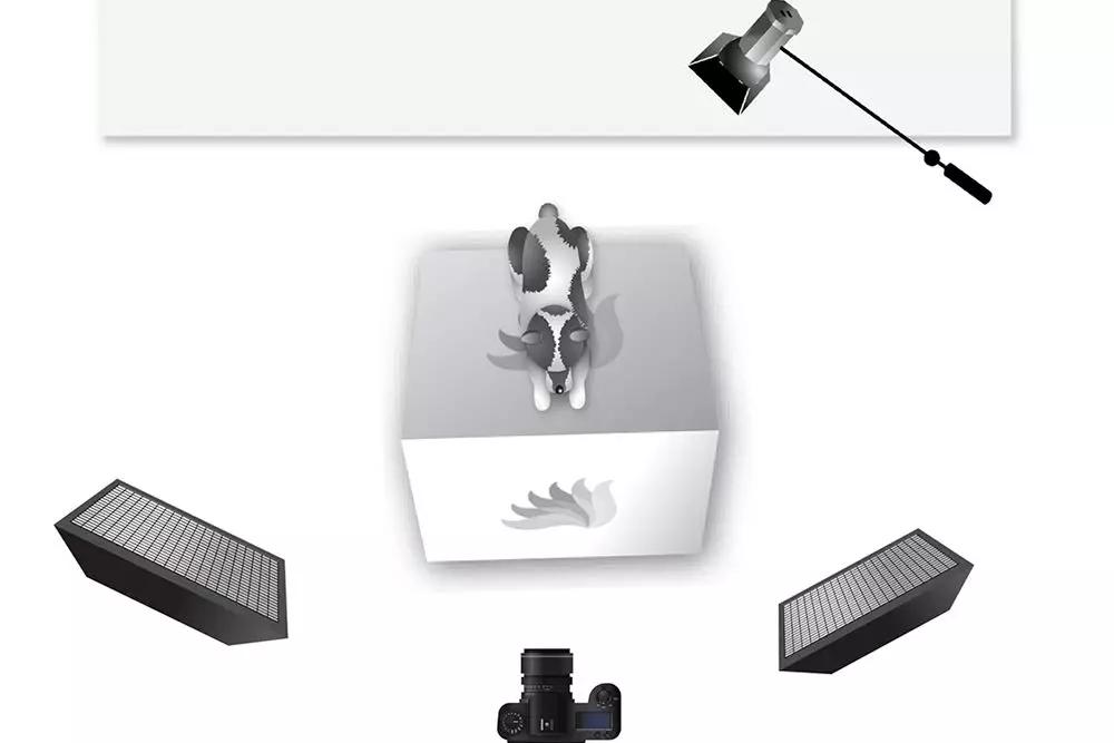 攝影師Mark C Hughes分享,他在攝影棚內(nèi)拍攝動(dòng)物時(shí)經(jīng)常采取的打燈方式——總共使用三個(gè)柔光箱(Softbox)、兩盞主光(Key light)分別從被攝物前方兩側(cè)45度角打光,再于后上方是只一盞發(fā)光(Hair Light)以點(diǎn)亮輪廓。這樣的配置能均勻照亮鏡頭前的主角,并使其與身后的背景分離開來。