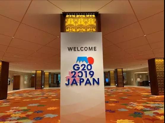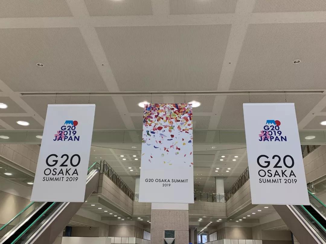 大阪麗嘉皇家酒店內,帶有二十國集團領導人大阪峰會會標的迎賓牌格外醒目。