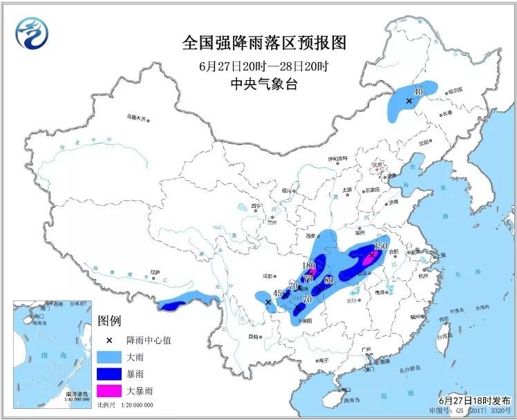 ·27日20時至28日20時,四川東部和南部、重慶、貴州北部、云南東北部、陜西東南部、河南南部、安徽西北部、湖北中西部、湖南西北部等地的部分地區(qū)有大到暴雨,其中,重慶北部、四川東北部、河南南部、湖北東北部等局地有大暴雨,最大小時降水量30~60毫米,局地可達(dá)70毫米以上,并伴有雷暴大風(fēng)等強對流天氣。