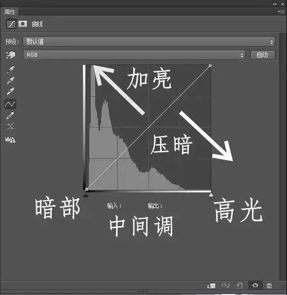 曲線調整圖層跟色階一樣的是都有直方圖,并且直方圖從左到右依次表示的是圖片在陰影,中間調和高光的像素分布。
