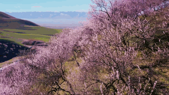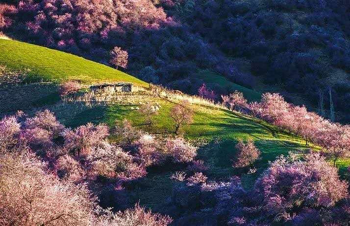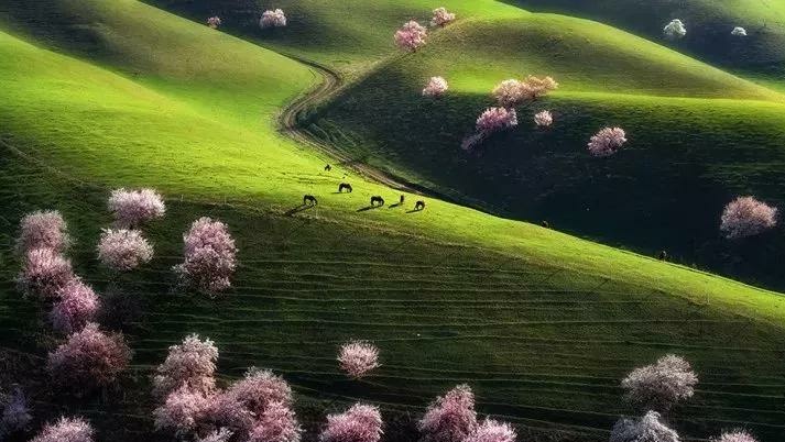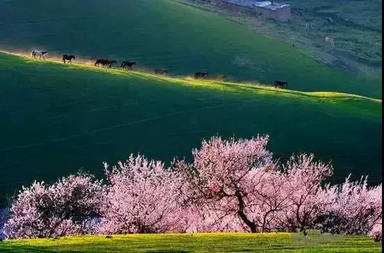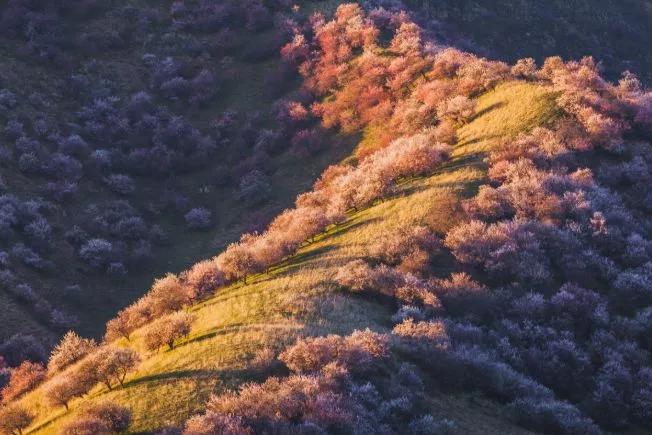 杏花溝山坡起伏,線條優美,每到春暖花開之際,隱藏在伊犁河谷深處的野杏林便變身人間仙境,完勝三生三世十里桃花。