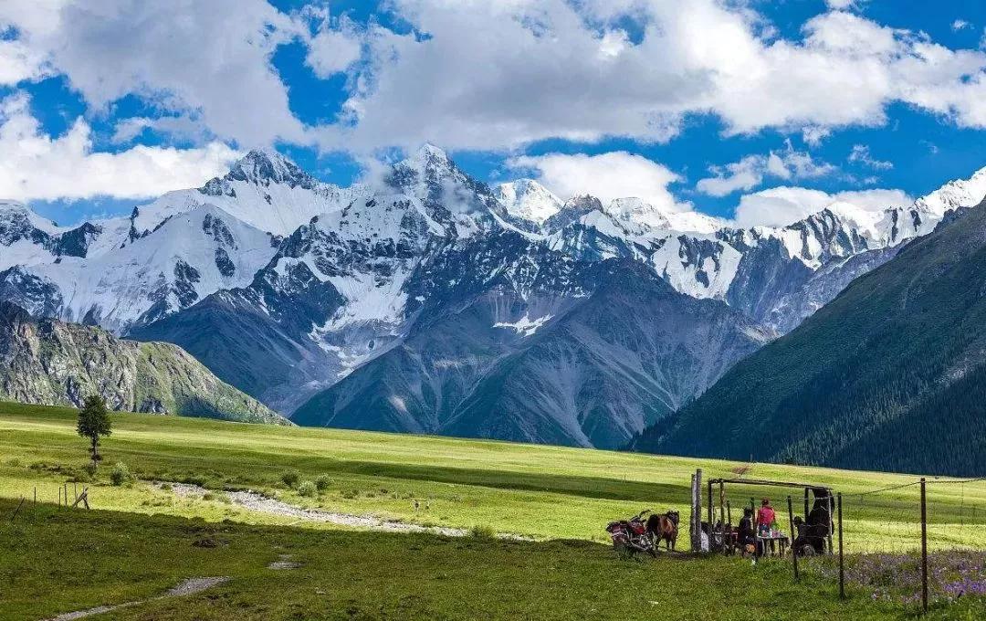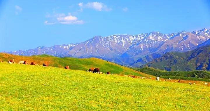 天山是亞洲最偉大的山脈之一,近處草原綠意盎然,牛羊成群,遠處山峰綿延,通體覆蓋著皚皚白雪,神秘圣潔。
