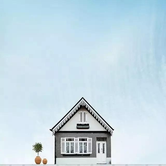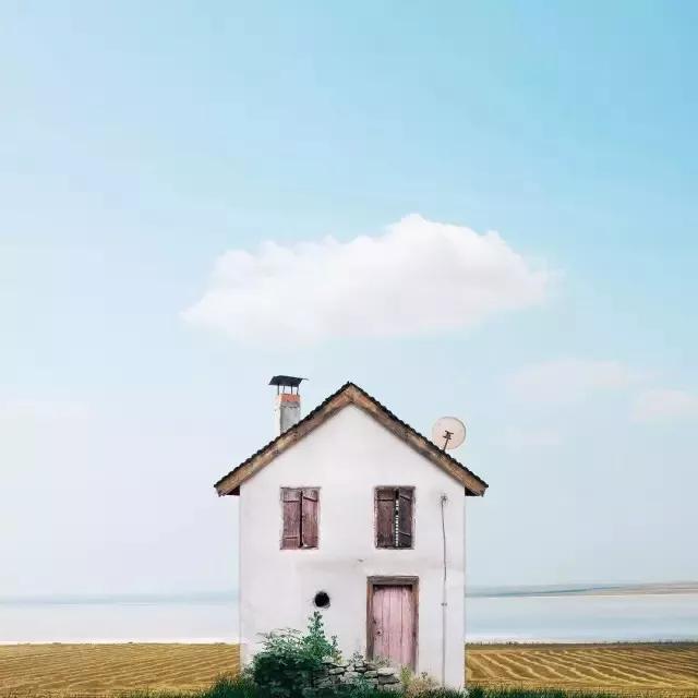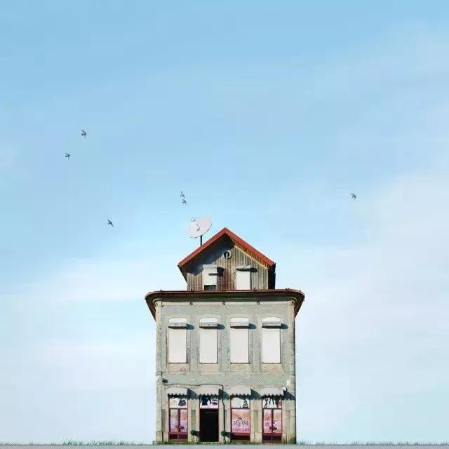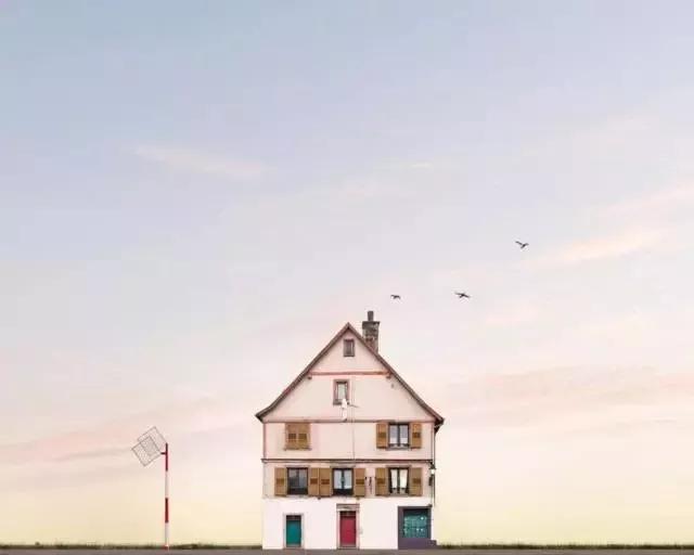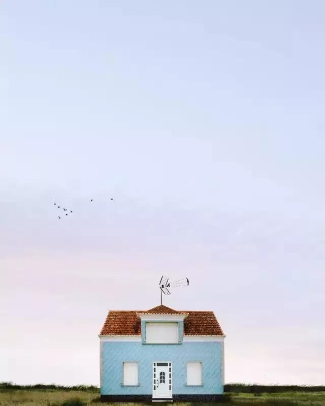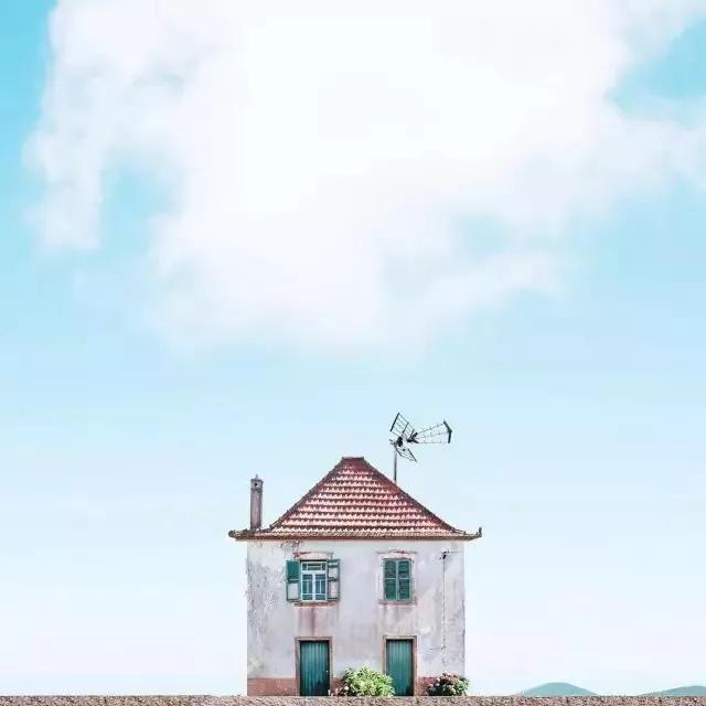 他的拍攝風(fēng)格統(tǒng)一,偏愛極簡構(gòu)圖,多以藍(lán)天白云為背景,畫面的主角則是一座小房子。