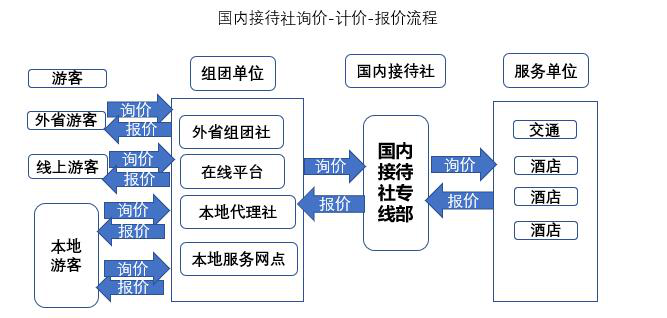 報價就有三種情況,一是接待社專線部給外省組團(tuán)社專線部報價,專線部在向外省組團(tuán)社服務(wù)網(wǎng)點(diǎn)報價,外省服務(wù)網(wǎng)點(diǎn)在向外省游客報價。二是接待社專線部給本地服務(wù)網(wǎng)點(diǎn)、本地代理商報價,服務(wù)網(wǎng)點(diǎn)和代理商再向本地游客報價。三是接待社專線給在線平臺報價,在線平臺給在線游客報價。