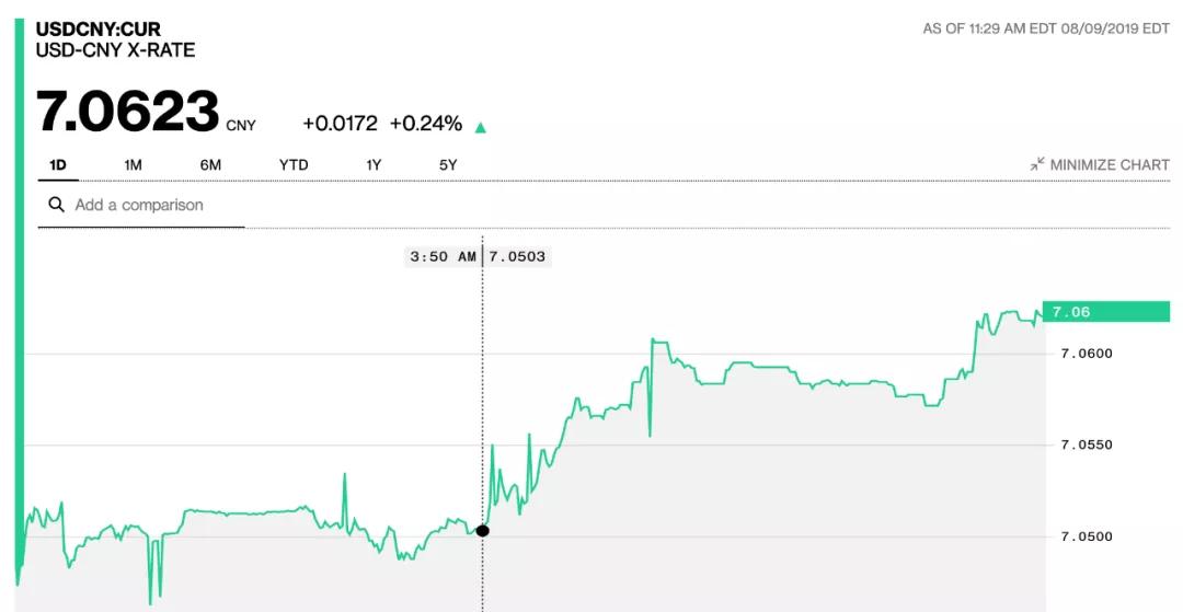 2019年8月5日上午,在岸、離岸人民幣兌美元匯率雙雙跌破“7”關(guān)口,刷新近幾年最低記錄。