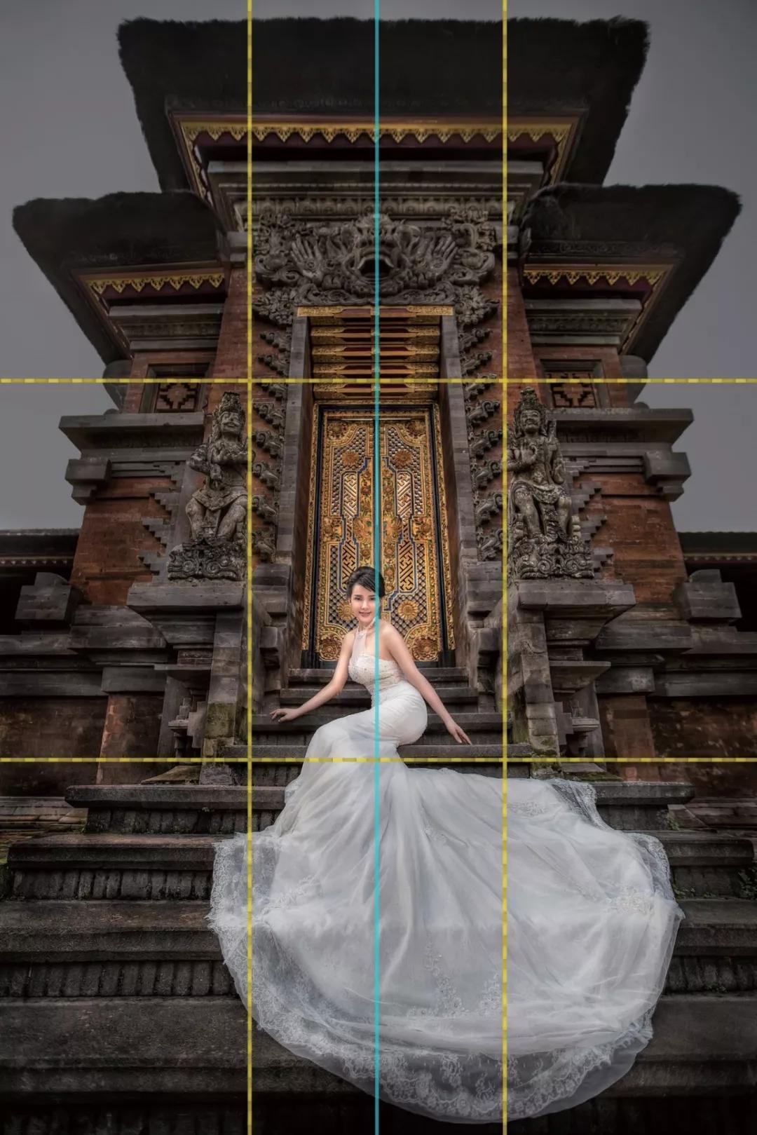 但其實這也是借用了建筑物的線條引導(dǎo),將觀者注意力從前景延伸到背景,又或者從背景過渡到畫面主體(藍色線為對稱參考線)。
