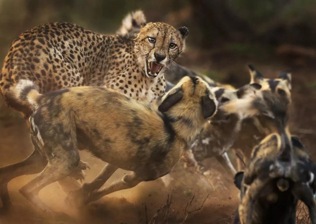 這只上了年紀(jì)的獵豹發(fā)出一邊發(fā)出“嘶嘶”地叫聲,一邊蓄力向這群野狗發(fā)起攻擊,它的左耳在打斗中被咬破,右耳在喧鬧的聲中緊緊壓下。攝影師 Peter 的鏡頭緊緊地跟著獵豹的臉,拍下了這場(chǎng)罕見(jiàn)的相遇。(由于棲息地的流失和被破壞,這兩個(gè)物種都已經(jīng)從他們大部分曾經(jīng)的棲息地中消失。)