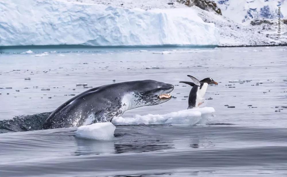 一只巴布亞企鵝正在一塊碎冰上小憩,突然間一只豹海豹從水面中沖出,長(zhǎng)著大嘴,攻向這只企鵝。巴布亞企鵝已經(jīng)是企鵝屆中游泳速度最快的選手了,它慌忙從碎冰上逃脫,但是在后面不慌不忙追趕的豹海豹此時(shí)似乎已經(jīng)將這場(chǎng)捕獵當(dāng)成了自己的游戲。