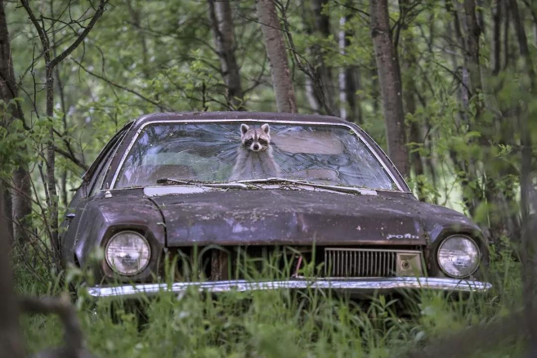 傍晚時(shí)分,在加拿大薩斯喀徹溫省的一個(gè)廢棄農(nóng)場(chǎng)里,一只浣熊將頭從一輛二十世紀(jì)七十年代福特的擋風(fēng)玻璃的碎洞中探出,而后座上正坐著它五個(gè)興奮的孩子。這位浣熊母親將頭探出后,仔細(xì)觀察了周?chē)h(huán)境很久,在確定安全以后,它趁著夜色鉆出了這輛車(chē)去為孩子們尋找食物。