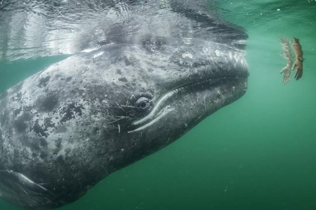 一頭好奇的灰鯨正在游向一位游客從水面游覽艇上伸下來(lái)的手。墨西哥下加利福尼亞半島中部地區(qū)圣伊格納西奧湖,灰鯨母親和她們的孩子們都會(huì)很積極的尋求和人類(lèi)的接觸,讓人們撓一下自己的頭或者后背。