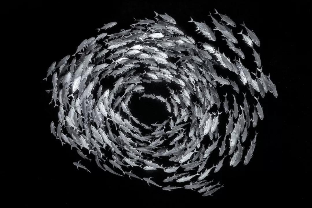 一大群六帶鲹在水里組成了環(huán)狀,它們這一行為是交配前的約會(huì)練習(xí),同時(shí)還可以威嚇一下潛在捕食者。像這樣的聚會(huì)產(chǎn)卵很容易被捕漁者一鍋端,但幸運(yùn)的是,這群魚(yú)生活在紅海禁止捕漁的海洋保護(hù)區(qū)域內(nèi)。