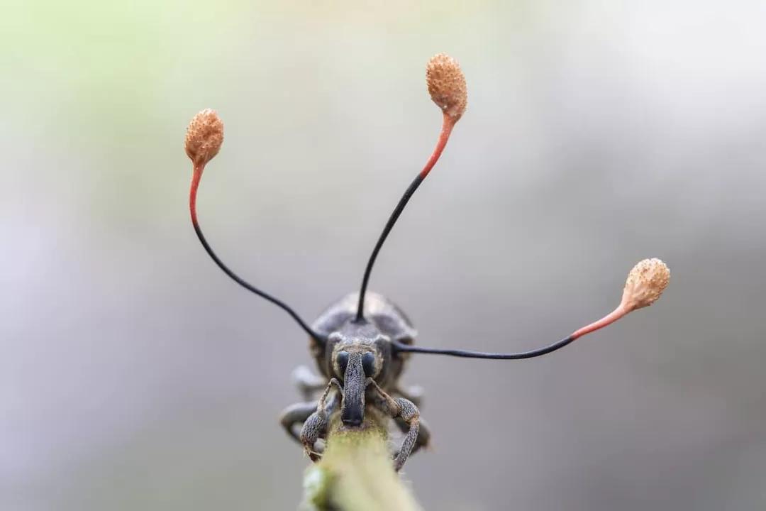 攝影師 Frank 在夜探秘魯亞馬遜熱帶雨林時(shí),發(fā)現(xiàn)了這只緊緊抓著蕨類(lèi)植物根部,長(zhǎng)相奇異的象鼻蟲(chóng)。它呆滯的眼睛顯示著它已經(jīng)死亡了,而從它軀干上長(zhǎng)出的三根觸角一樣的東西則是一種寄生在象鼻蟲(chóng)身上的真菌。