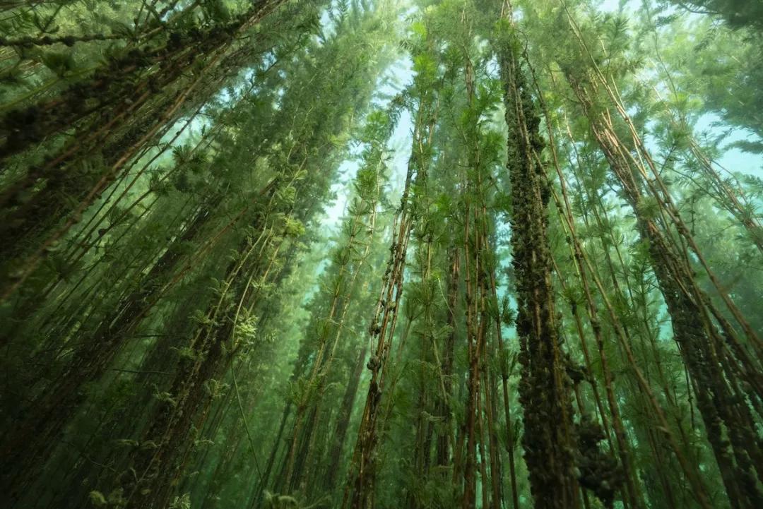 在他貼著水面游動(dòng)的時(shí)候,他突然發(fā)現(xiàn)一個(gè)巨大的長(zhǎng)矛消失在下面的雜草中。他向下游去,游近了才發(fā)現(xiàn)自己仿佛置身于一個(gè)水下叢林中, Michel 用廣角構(gòu)圖的方式營(yíng)造出一種置身于參天大樹(shù)的森林中,從地面向上凝視的感覺(jué)。