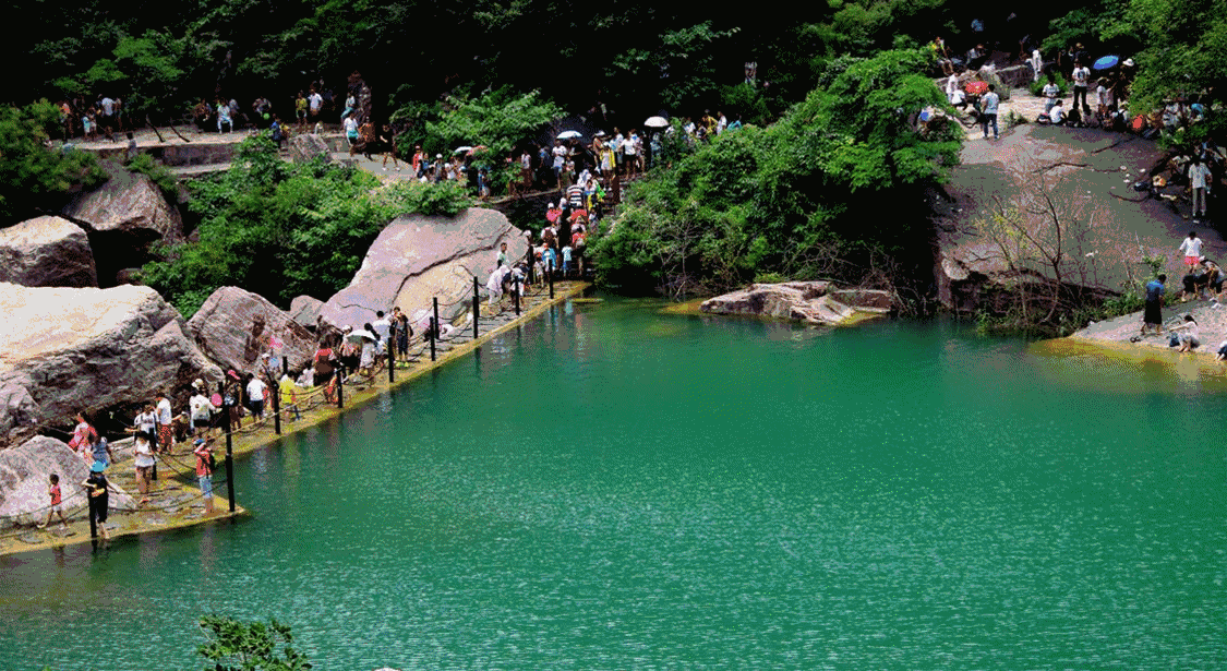 主要景觀有:猿人峰、守望臺、奇石走廊、清水華蓋、紅石廣場、翡翠潭、青苔瀑、見龍瀑、飛龍瀑、躍龍瀑、雙龍瀑、五連瀑等豫北最大的瀑布群,景點多達100多處,一步一景,一景一奇;其中見龍瀑落差達320米,瀑布最大流量可達3000立方米/秒,似云龍飛瀑,氣貫如虹,號稱“中原第一瀑”,翡翠潭碧綠無暇,明麗如畫,潭水蕩漾,猶如人間仙境,被譽為“太行第一潭”
