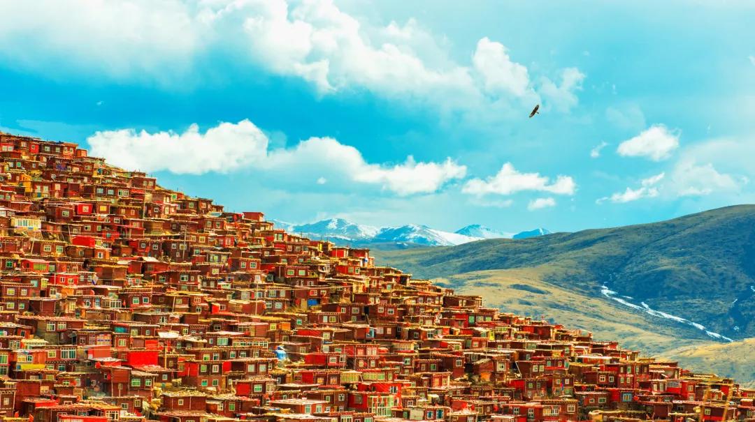 之后到達洛若鎮,穿過塔林進入五明佛學院,震撼的佛國畫卷漸漸呈現在眼前--入目處盡是朱紅的佛色,裹著紅袍的僧人在其間穿行,空氣里彌漫著佛香;