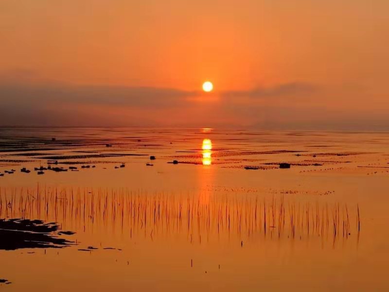 下午:拍攝沙江日落S灣風光、海帶場風光,產生靈異神秘的色彩.可拍松港北岐、三沙小皓、三沙東壁、三沙古鎮紫菜養殖,三沙鎮花竹、沙江鎮沙塘里、溪南鎮圍江等地的海上日出,沿海的收紫菜,鹽田鄉連家船,楊家溪紅楓林等。
