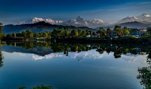 【博卡拉】(另譯博克拉),尼泊爾最為盛名的風景地,海拔800多米,市區人口不足10萬,與熱鬧喧囂的加德滿都比起來要恬靜很多,特別是博卡拉處于喜馬拉雅山谷地,依偎在終年積雪的安娜普爾納山峰和魚尾峰下,傍著迷人的費瓦湖,蒼翠繁茂的植被和壯麗的雪山風光形成強烈對比,成為尼泊爾最受歡迎的旅游地點之一;