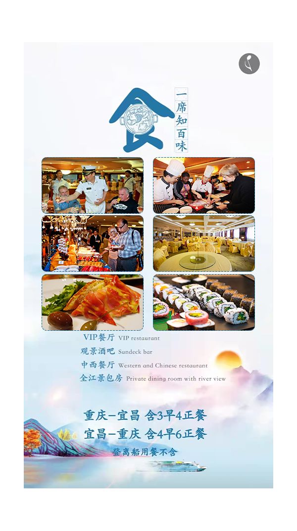 17:00——晚餐成人:不含餐 兒童:不含餐登船當(dāng)日(大多數(shù)游船)晚餐不在船票所含安排之內(nèi),建議可晚餐后登船。 1、常規(guī)重慶登船為朝天門碼頭,然而朝天門碼頭又細(xì)分為十幾個(gè)小碼頭,游船停靠就類似于火車停靠站臺(tái)一個(gè)道理,游船具體停靠在朝天門的幾號(hào)碼頭以實(shí)際停靠為準(zhǔn),為了防止游船臨時(shí)變更停靠碼頭,造成走錯(cuò)碼頭的情況出現(xiàn),一般我們會(huì)在登船當(dāng)天中午找游船前臺(tái)再次核實(shí)登船碼頭后中午12點(diǎn)前告知您具體朝天門幾號(hào)碼頭登船,建議您登船前可以撥打游船電話再次核實(shí)登船碼頭。