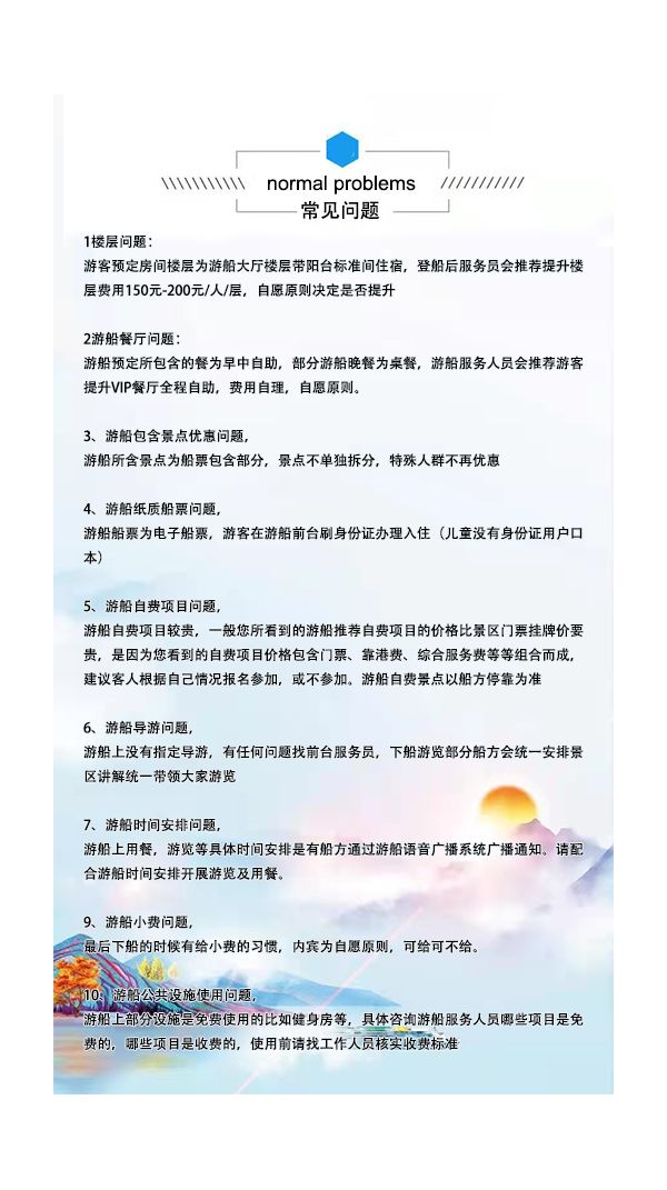 登船后工作人員會(huì)向您推薦游船二次消費(fèi)服務(wù)【沒有項(xiàng)目是強(qiáng)制的,游輪前臺(tái)均為建議,您都可以不選擇】
