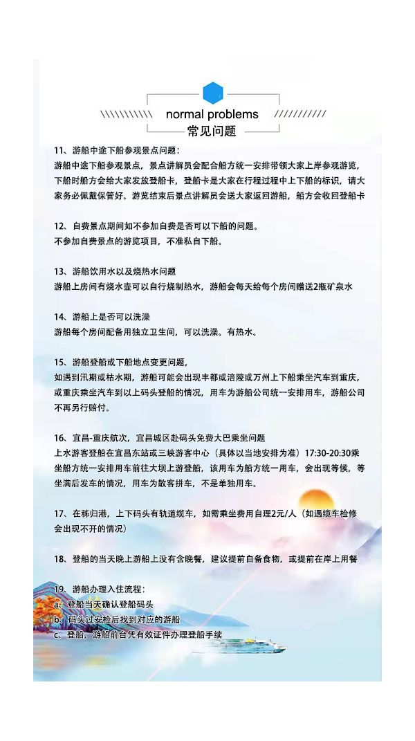 2由于游輪受長江水位/氣候/航道條件的影響,當(dāng)出現(xiàn)水位過高或過低、大霧以及禁航管制等不可抗力情況,等船碼頭可能會(huì)改停豐都或涪陵碼頭,此種情況下船方會(huì)采取安排游客到重慶市內(nèi)指定區(qū)域集合,乘坐大巴車前往下游在豐都或涪陵碼頭登船,乘車一般是3小時(shí)左右集體以實(shí)際行駛時(shí)間為準(zhǔn)!少乘坐的這段船程無景點(diǎn)游覽安排,不會(huì)影響行程中景點(diǎn)游覽,游船公司安排車輛為游船統(tǒng)一散拼用車,不是單獨(dú)包車,會(huì)出現(xiàn)拼車的情況。游船公司不再收取額外的車費(fèi),也不會(huì)再對(duì)少坐船的這一段進(jìn)行補(bǔ)償。選購此產(chǎn)品視作默認(rèn)同意此條款。(是否從涪陵或豐都登船,以游船通知為準(zhǔn))。