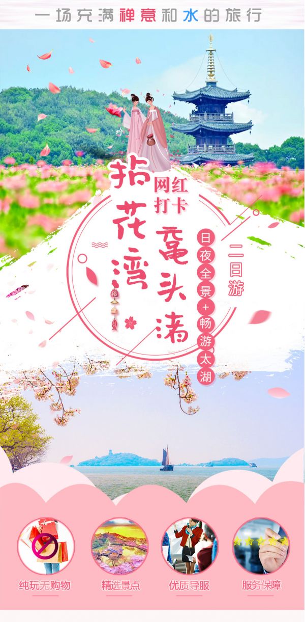08:00——景點/場館前往:黿頭渚(含首道門票)黿頭渚是太湖北部的一處半島,形似浮黿翹首而得名。在這里你可以游覽龐大的園林群,坐船感受太湖的煙波浩渺,登太湖仙島一探秘境,也可以在春日來此品賞櫻花,體會“太湖佳絕處、畢竟黿頭渚”的意境。每年春季櫻花齊放是這里的一大奇觀,更有熱鬧的櫻花節。黿頭渚三面環水,既有山長水闊、帆影點點的自然美景,又有小橋流水的山鄉田園風光,是太湖山水景色大美之處。太湖仙島是黿頭渚必游之處,島上有道教仙宮和道、佛兩教石窟塑像。登臨半島上的鹿頂山可環顧湖濱翠色,天氣晴好時能看到湖面上的翩翩舟影,感受到太湖的浩淼之美。黿頭渚作為賞櫻之地,其獨特之處,一是“水陸空”全景式賞櫻。二是可以在夜晚賞櫻,櫻花與燈光結合,美不勝收。黿頭渚的早櫻一般于3月上旬開花,多為單瓣或半重瓣。依櫻花的開花時序,將其分為早、晚櫻,早開櫻花的類別多,花期(從初開、盛開到花落)一周時間,晚櫻花期可有7-10天,受升溫速度影響,早晚花期有5-12天的間隔,期間是一些雜交品種櫻花開放。一般3月中下旬的時候染井吉野櫻進入盛花期,也就是最佳觀賞期了。具體哪段時間進入盛花期需要看當時的天氣,如果有冷空氣的話,可能就會推遲盛花期。