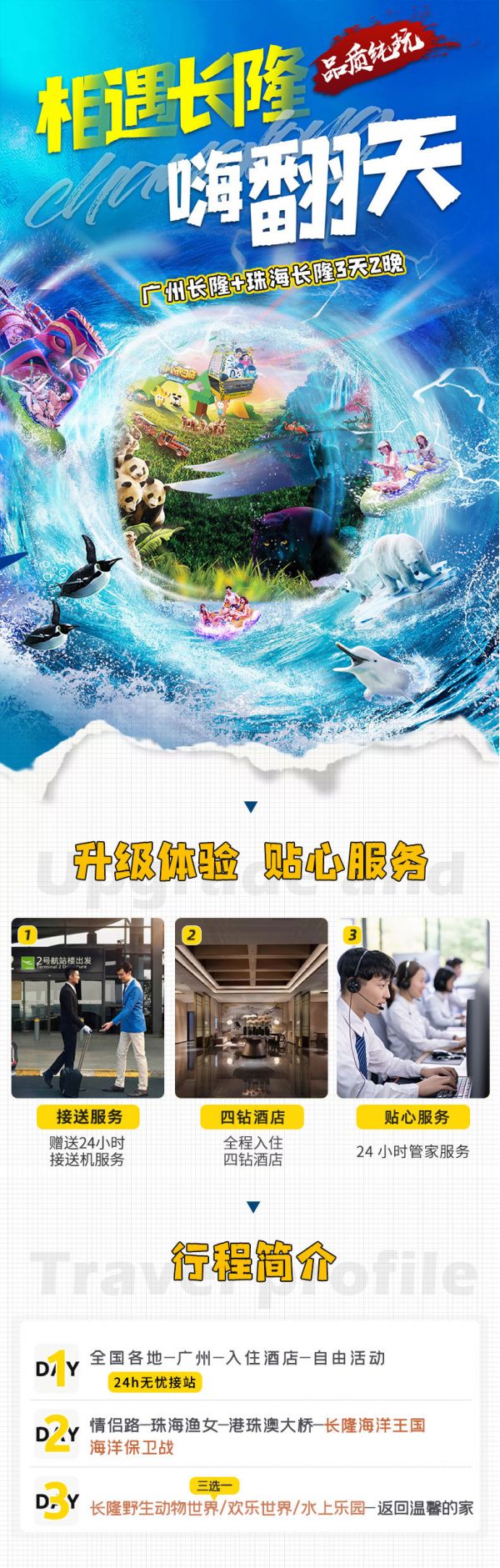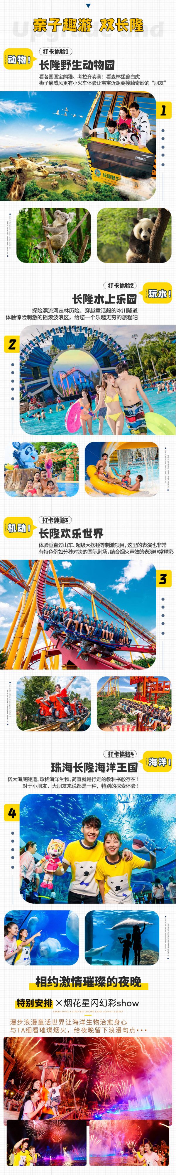 13:00——前往:珠海長隆度假區,珠海長隆國際海洋度假區地處珠海橫琴新區,包括長隆海洋王國、橫琴島劇院等眾多主題樂園,以及橫琴灣酒店、企鵝酒店、馬戲酒店等豪華主題酒店,配套設施完善,是周末與親朋好友出游的好去處。