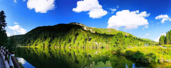 雙龍海海拔2200米,長290米、寬247米、水深9米,透過晶瑩的湖水,可見湖中有兩條帶狀的生物鈣華堤埂隱藏于水底,湖堤上部為鈣華,下部為冰磧物,宛如兩條蛟龍,似動似靜。