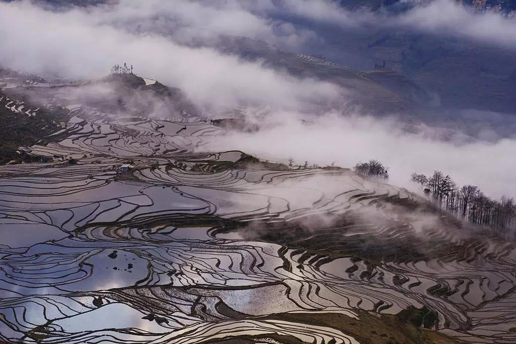隨著朝陽逐漸爬上藍天,梯田中濃濃的水汽也慢慢化開,像是一滴白滴入了金的底色,在這精致的春景中一點點地蔓延開來,飄飄欲仙,美如仙境;
