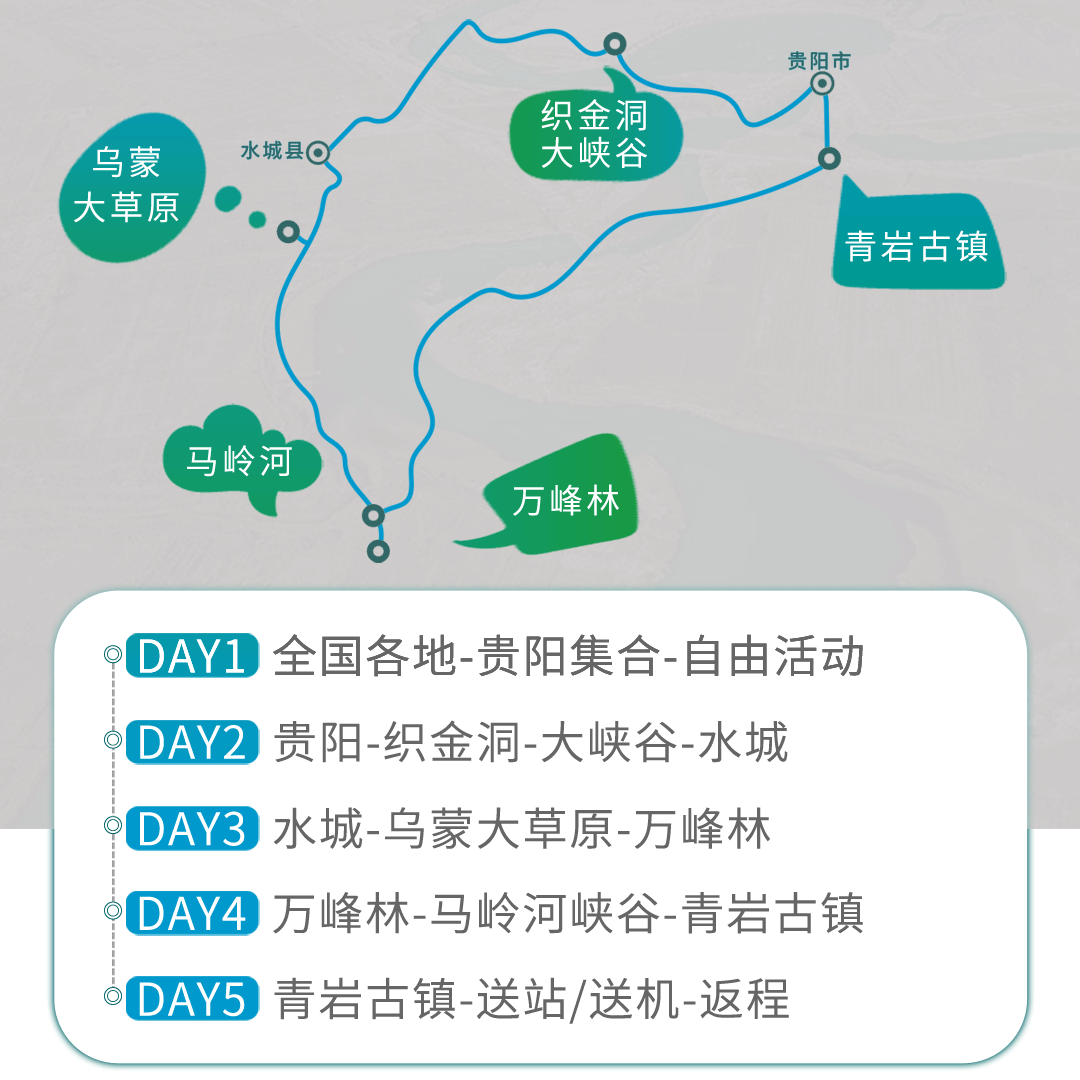 門票:織金洞門票(含景交車)、織金大峽谷門票(含景交車及玻璃電梯)、烏蒙大草原門票(含換乘車)、萬峰林門票(含觀光車)、馬嶺河峽谷門票、青巖古鎮首道門票