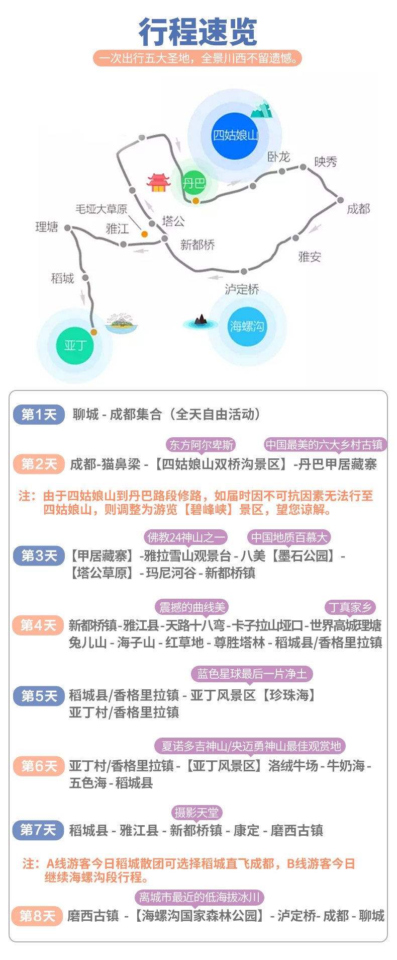 D8 磨西古鎮— (約1公里/4分鐘)海螺溝國家森林公園— (約315公里/5.5小時)成都市區— 聊城