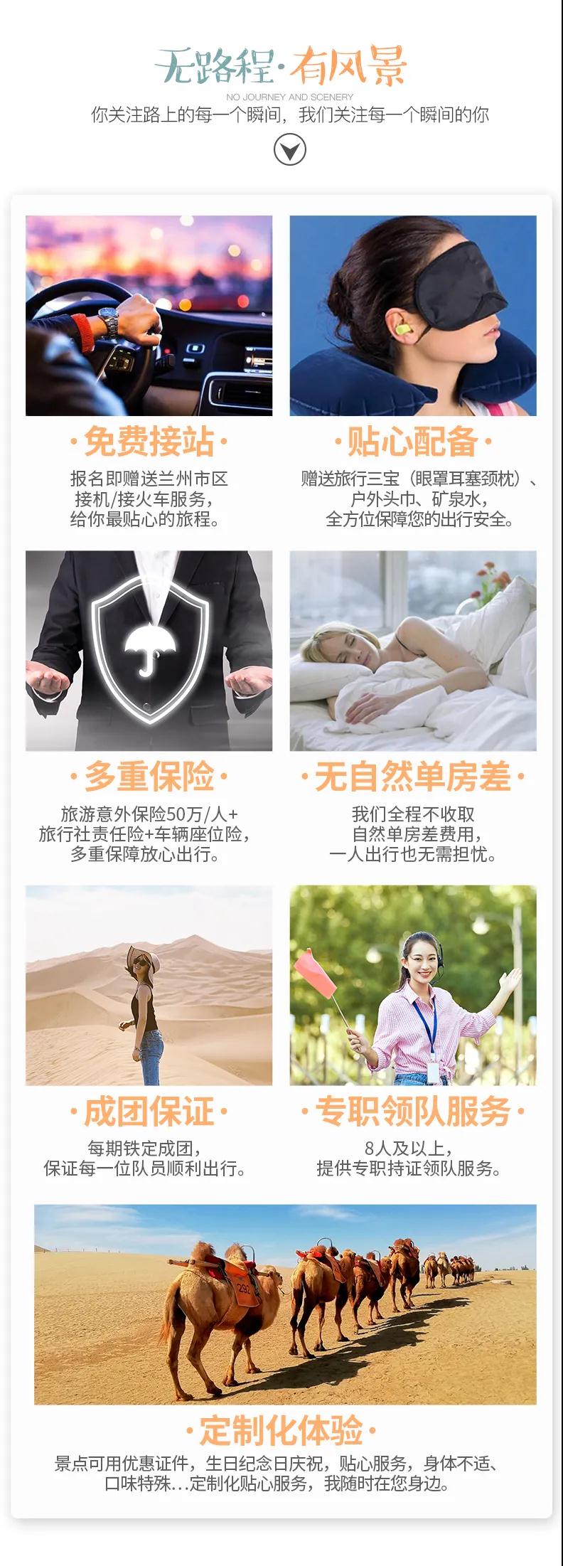 1. 敦煌莫高窟景區(qū)自2015年6月起實行數(shù)字展示中心數(shù)字洞窟展示和莫高窟實體洞窟體驗的預約參觀模式,每天限6000人參觀,團隊參觀時間嚴格按照莫高窟預約場次進行,因此,敦煌段景點參觀順序會根據(jù)莫高窟時間進行調整或同團客人安排不同時間游覽,敬請配合。