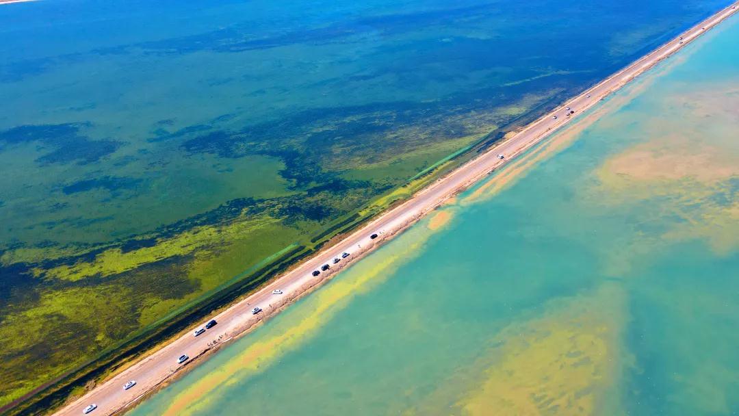 我們先抵達【西臺雙色湖】,西臺吉乃爾湖的神奇之處在于一條泥路將湖水一分為二,一半是蒂芙尼藍,一半是純粹的綠;左邊碧綠如玉的是淡水湖,右邊瓦藍如天的是鹽水湖,雖然他是鹽湖,但是它那獨有的特色在中國也能領略到堪比馬爾代夫的亮點,顛覆了你對任何湖的想象。最重要一點是這里還是一個未被開發的超小眾地方,沒有摩肩擦踵,才有更好的風景。