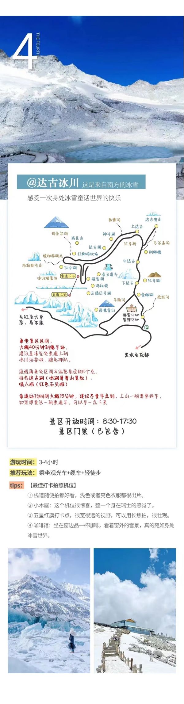 (1)達古冰川景區(qū)山頂海拔達到4860米,可乘坐索道抵達,您可根據(jù)自身身體狀況選擇前往,進景區(qū)后請不要劇烈運動,景區(qū)內(nèi)有大型天然氧吧,如有不適應可以進氧吧休息。