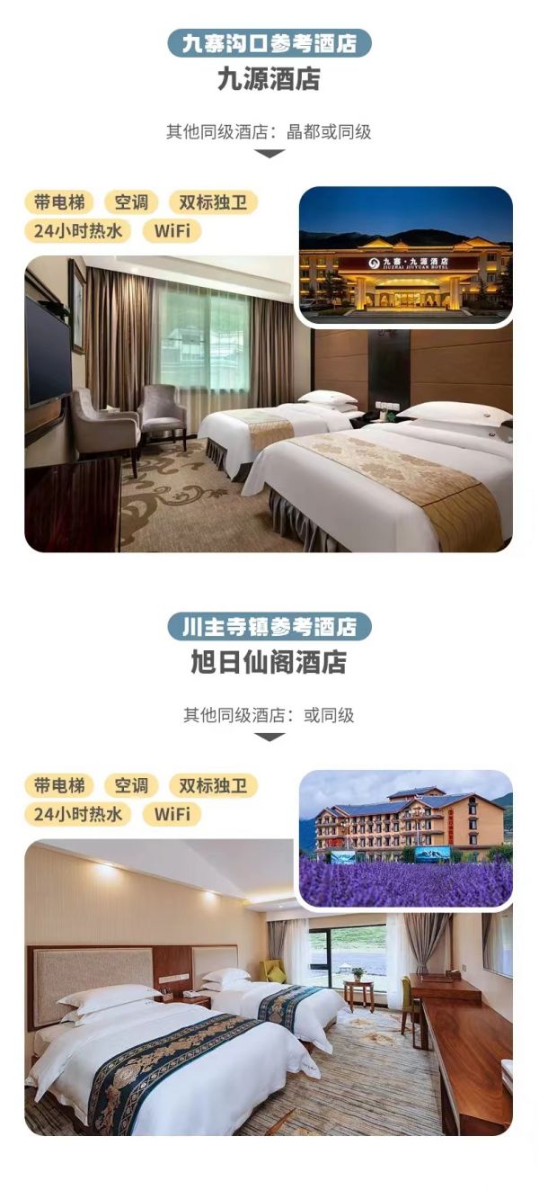 今天,早餐后由司機驅(qū)車統(tǒng)一帶領游客【九寨溝景區(qū)】門口。令人魂牽夢繞的九寨溝將為你揭開美麗動人的神秘面紗。(九寨溝為自然風景游覽勝地,以拍照參觀為主,游覽時間7-9 小時);翠海瀲滟,天水相接;瀑布生煙,氣勢磅礴;彩林絢麗,千姿百態(tài),雪山巍峨,銀峰玉柱。珍珠灘,飛珠濺玉;五花海,流光溢彩;長海,靜穆幽深......移步換景,令人目不暇接,群山如畫,綠水如詩,詩情畫意,韻味無窮。 游覽結(jié)束后前往九寨溝溝口酒店入住休息(或根據(jù)當日車況等情況,看需不需要調(diào)整到川主寺鎮(zhèn)入住)。