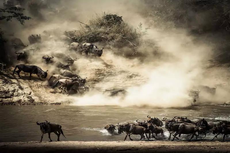 每年馬賽馬拉都會上演世界上最偉大的自然奇觀,那就是舉世聞名的動物大遷徙。從7月到10月,位于北方的馬賽馬拉因連綿的降雨而孕育出新鮮青草地,芬芳的青草氣味,將一百三十萬原居于南面塞倫蓋蒂的牛羚深深吸引,使之匯聚成為動物世界最大的一組移動群體,并且,無懼水里那兇猛的大鱷魚,前樸后繼的,前呼后擁的橫河跨境,進(jìn)入新天地。他們越過邊坦肯邊境進(jìn)入開闊的馬賽馬拉, 在廣袤的地平線上如浪潮般一波一波涌進(jìn)來。如斯景象,也造就了獨(dú)步天下,舉世無雙的牛羚(角馬)大遷徙。