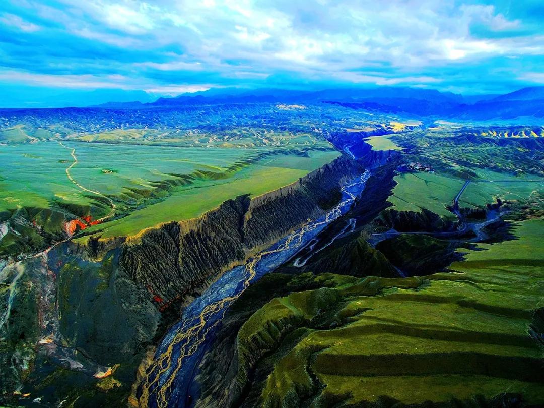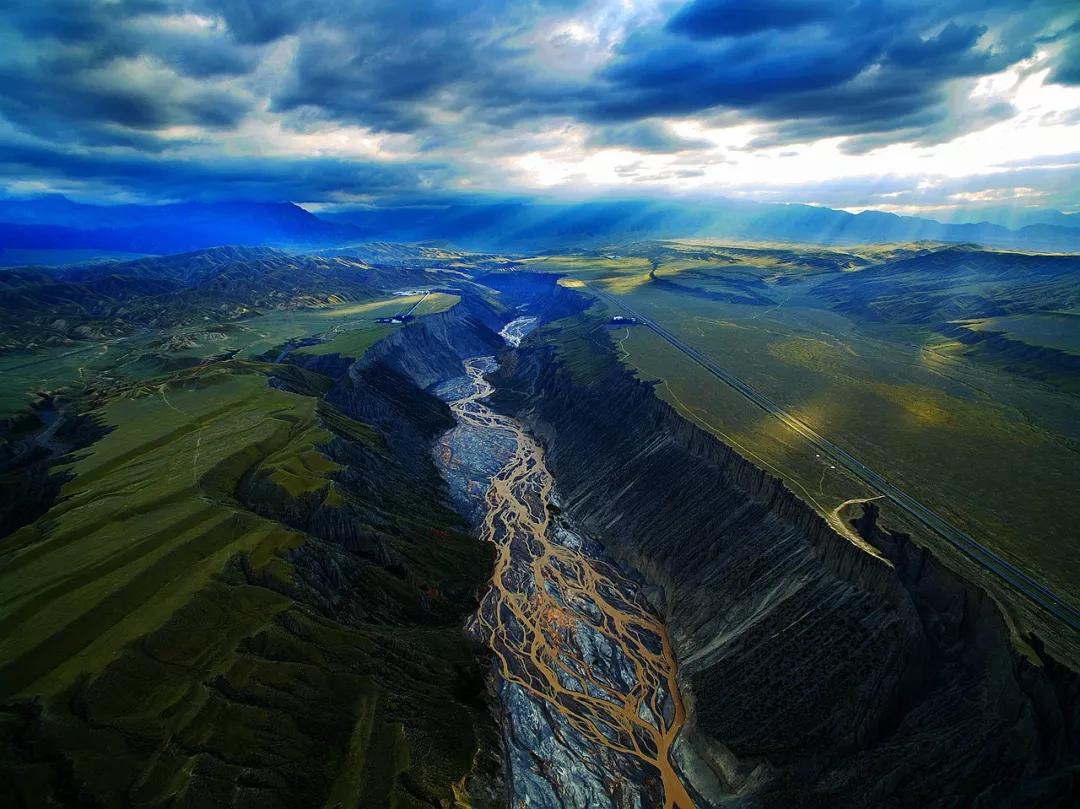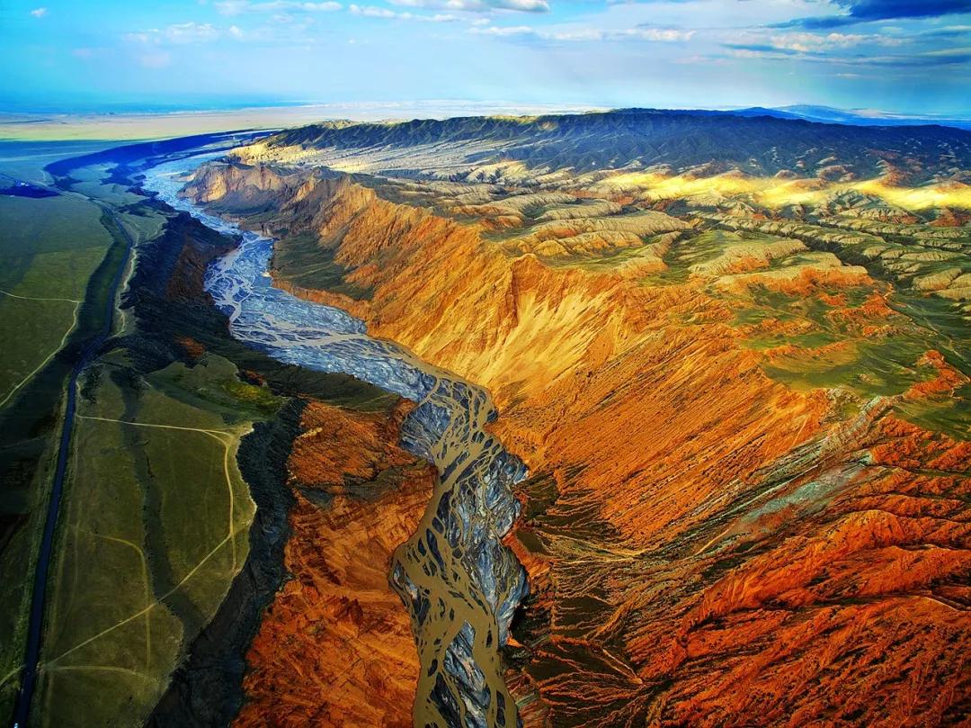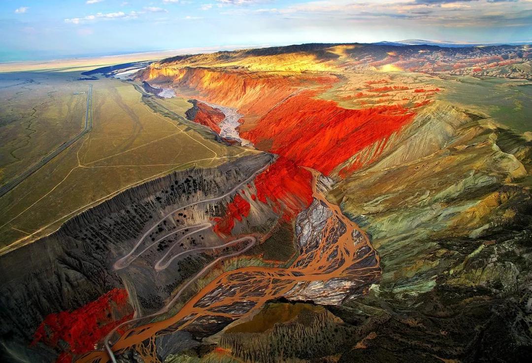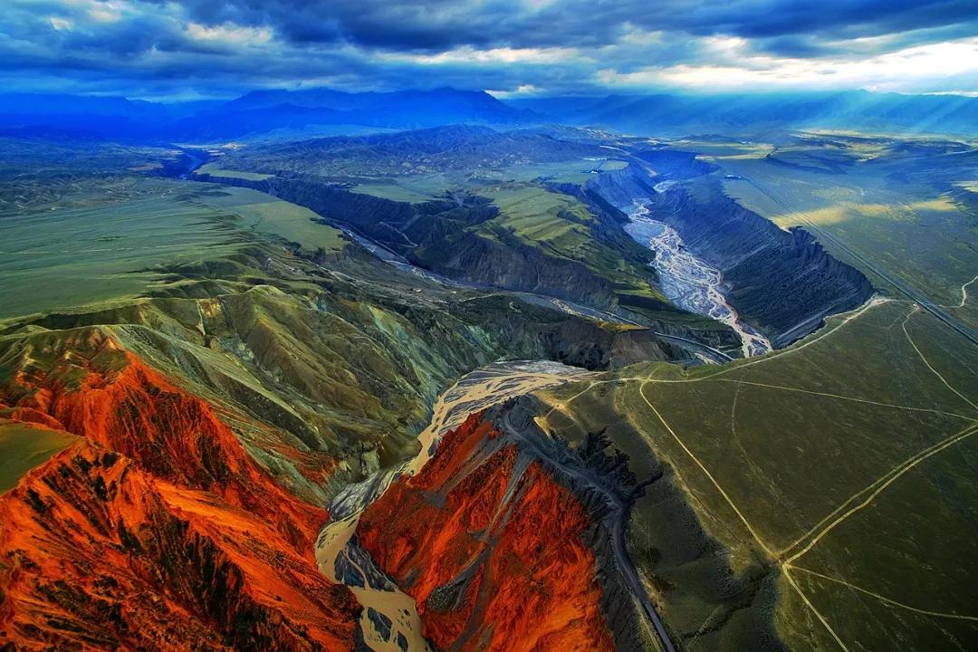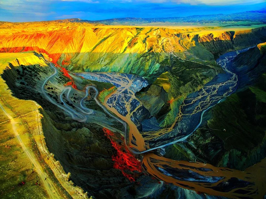 從高空看,安集海峽谷的色彩異常豐富,河流切割大地,將不同顏色的巖層沖刷溶解,形成了一幅絢麗多彩的大地抽象畫景觀。與其他一些色彩灰冷單調(diào)的峽谷相比,擁有紅山、黛崖、青峰、綠島、碧水等豐富色彩的安集海峽谷,就像一條彩帶飛舞在天山北坡腳下,成為中國峽谷群中一條色彩最豐富的大峽谷。