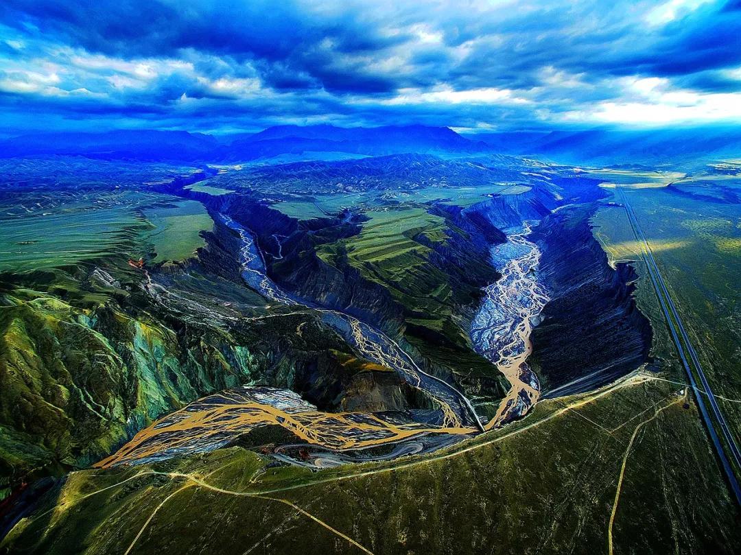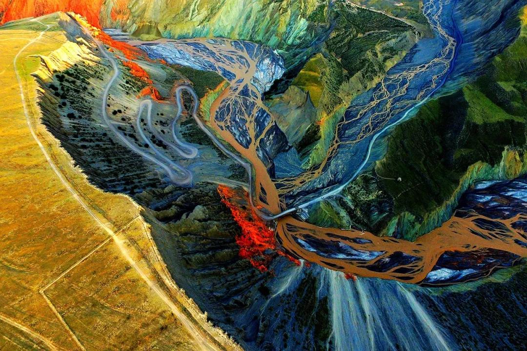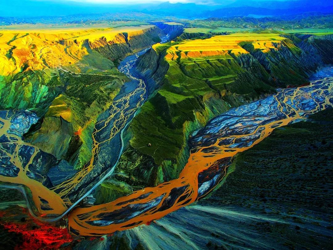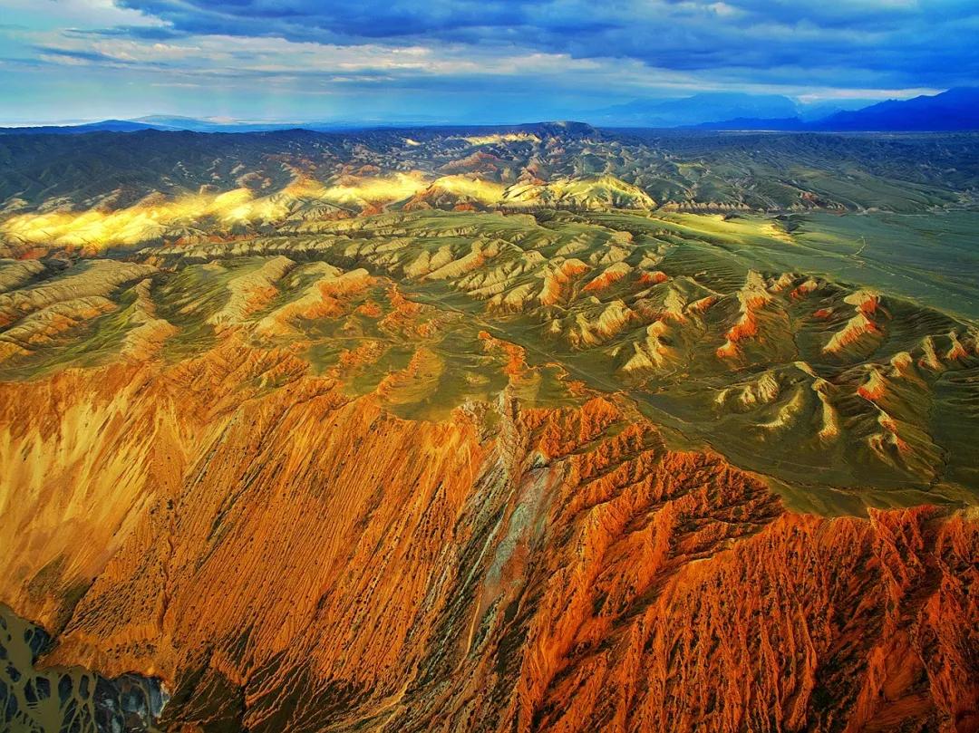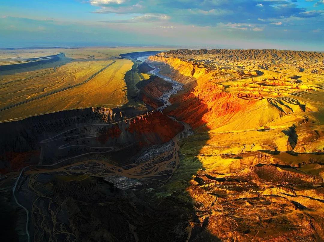 從高空看,安集海峽谷的色彩異常豐富,河流切割大地,將不同顏色的巖層沖刷溶解,形成了一幅絢麗多彩的大地抽象畫景觀。與其他一些色彩灰冷單調(diào)的峽谷相比,擁有紅山、黛崖、青峰、綠島、碧水等豐富色彩的安集海峽谷,就像一條彩帶飛舞在天山北坡腳下,成為中國峽谷群中一條色彩最豐富的大峽谷。