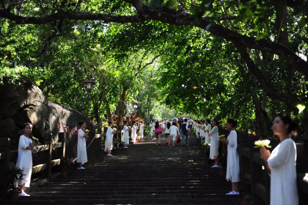 石梅灣是一片原始的南國景觀,三面環(huán)山,一面向海,山形秀美,石梅灣長長的海灘兩端,各向海中伸出兩座峰巒。