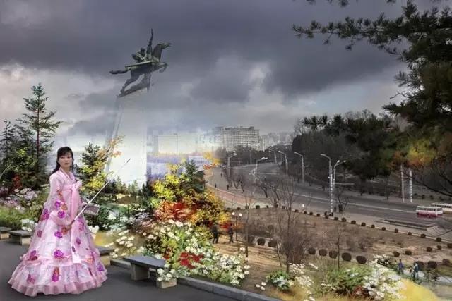 簡而言之,她把自己拍攝的現(xiàn)實影像與宣傳畫中的朝鮮拼貼在一起,帶來了觀看這個神秘國度的全新視角。在這些作品中,戲劇化的沖突與超現(xiàn)實的景象被巧妙重組,令人錯亂的同時也讓人驚醒:發(fā)生在朝鮮的一切不正是如此嗎?