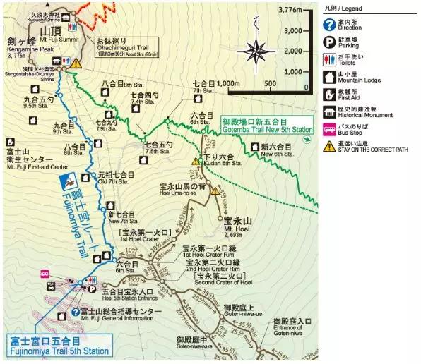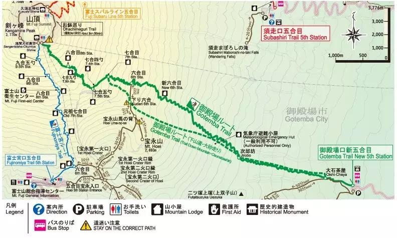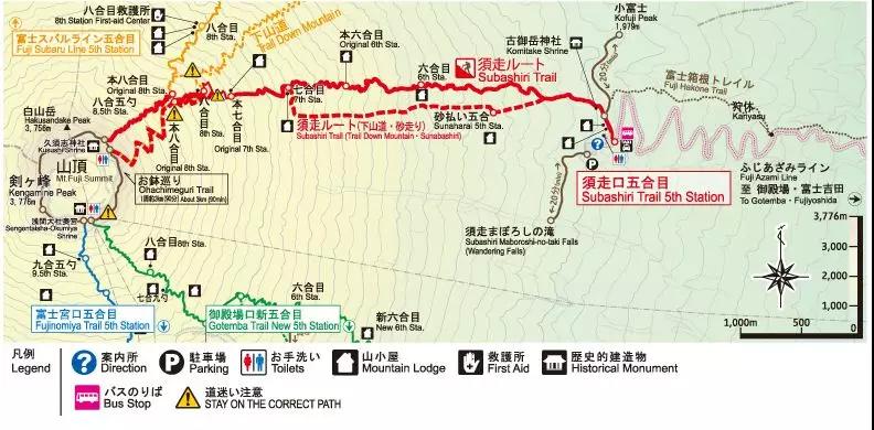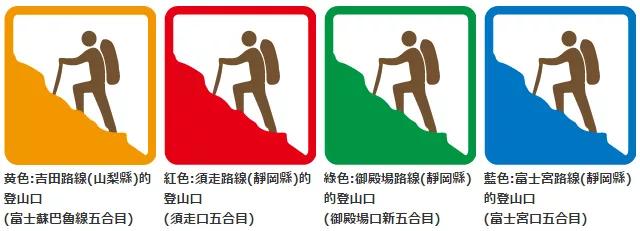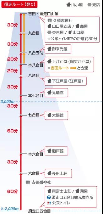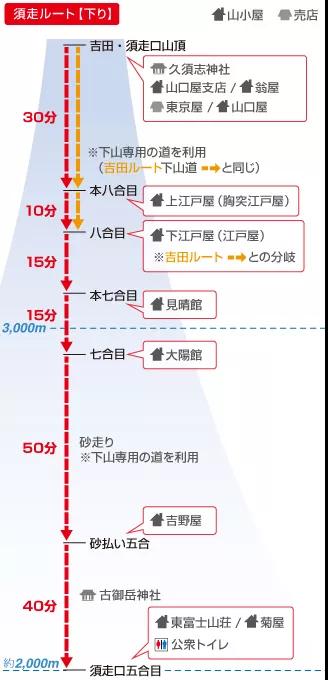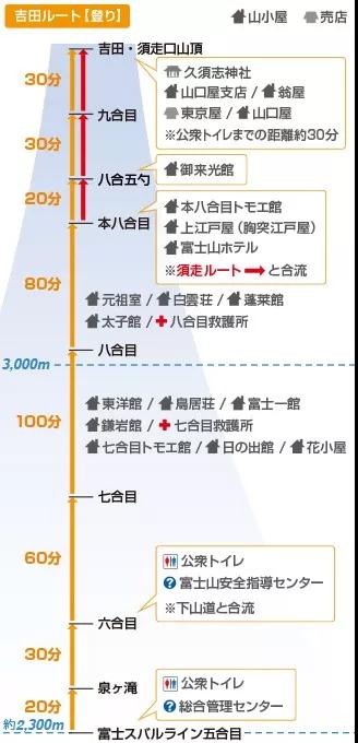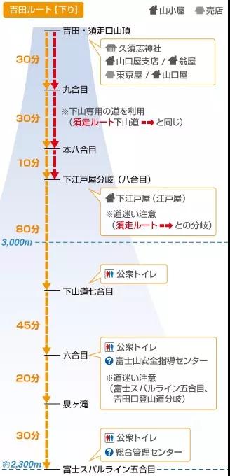 登山道跟下山道除了七合目以上的地方,其余都是不同的。山路上山小屋很少,多位于七合目附近,要自己備好比較充分的水和干糧。除此之外,也沒有救護所。