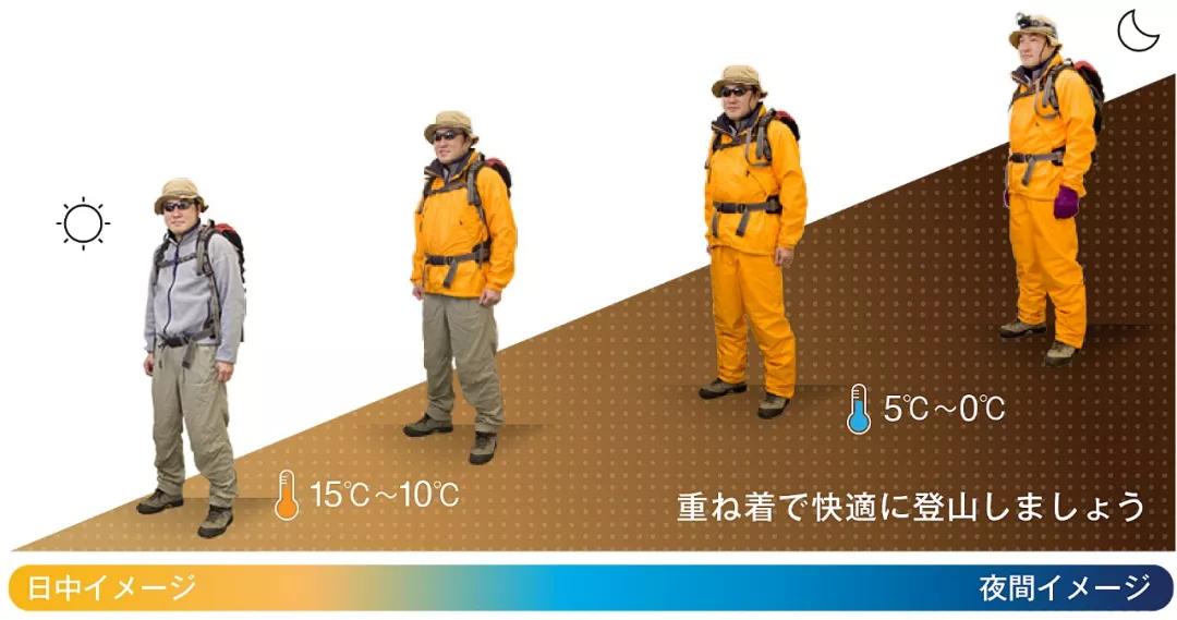 富士山是日本第一高峰,即使在盛夏,山頂的體感溫度有時也在零度以下。當攀登富士山超過3000米時,天氣可能會迅速變化,甚至可能造成下山延遲。所以出發前一定要檢查自己的裝備,尤其是較舊的裝備有沒有存在損壞。為了能夠安全舒適地登山,請準備好以下裝備。