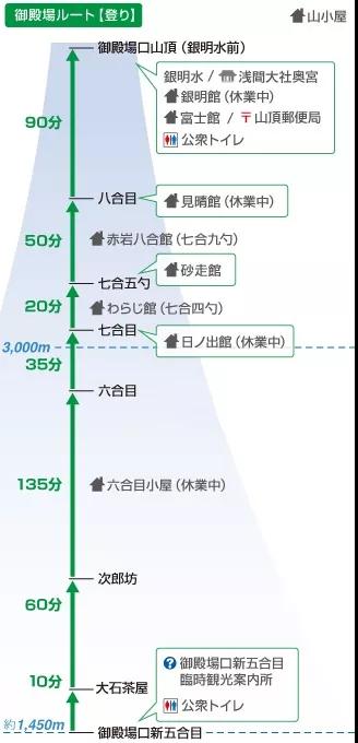 登山道和下山道完全一致,整個路線有很多巖石地,山坡比較陡峭。每個合目都有山間小屋,在八合目設置有救護所,五合目有商店和食堂等,可以購買水或簡單的裝備,進行休息。