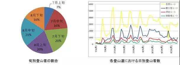 7月中旬以后,登山人數逐漸增加,特別是在周末和盂蘭盆節期間最為集中,為了能夠安全舒適地登山,最好避開周末及節假日出行。